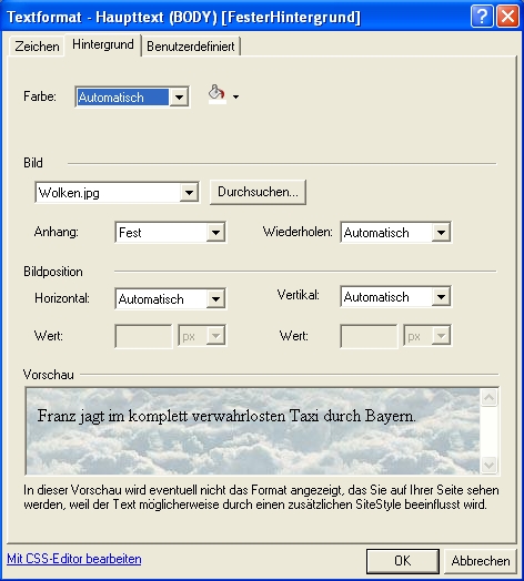 ... nun klickt auf den Reiter “Hintergrund”,wählt Eure Foto und stellt bei Angang: “Fest” ein.Anschließend auf “OK” klicken und fertig.