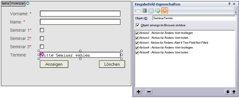 Für diejenigen, die das noch ein wenig weiter betreiben wollen, unten noch ein Bild meiner “Aktionen” für das Eingabefeld, in dem die Termine angezeigt werden. Hiermit verhindere ich, dass die Termine, die mittels der Radio Buttons gewählt wurden, händisch überschrieben werden können. Hier eine Kurzbeschreibung dieser “Aktionen”: |