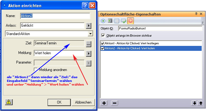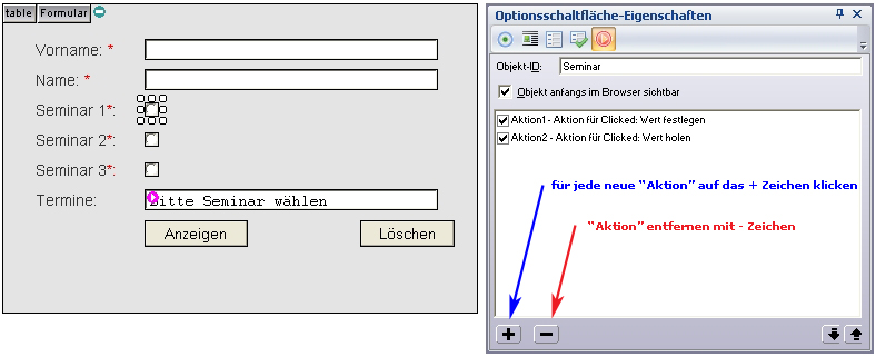 ... dann markiert Ihr den ersten Radio Button und klickt im Fenster “Optionsschaltfläche-Eigenschaften” (F3 Taste) auf den rechten Button oben “Aktionen” und anschließend auf das “+” Zeichen unten links um eine “Aktion” hinzuzufügen. |