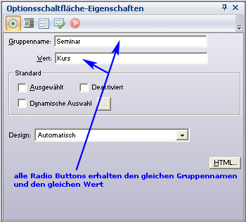 ... Ihr könnt nun diesen ersten Radio Button kopieren und beliebig oft einfügen. Dann ändert Ihr lediglich unter dem Parameter “Werte ...” die Termine für die anderen Radio Buttons und fertig. |