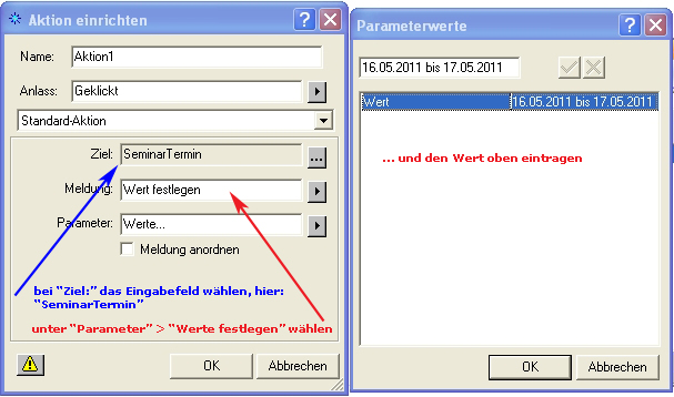 Anschließend klickt Ihr auf “Meldung:” und wählt “Merkmal festlegen” und danach bei “Parameter:” auf “Werte” und tragt dann dort oben im Eingabefeld Eure Werte ein (hier die Termine). Anschließend klickt Ihr auf das Häkchen und “OK”, wie im Bild oben zu erkennen ist. |