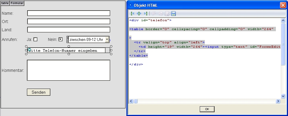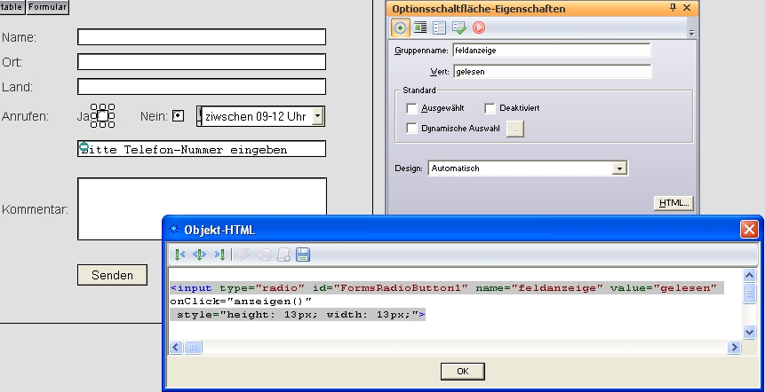 Ich setze also im Skript oben den Befehl ‘style.display’, entsprechend der Objekt-ID, zum einen für "auswahl" und zum anderen für “telefon” um.