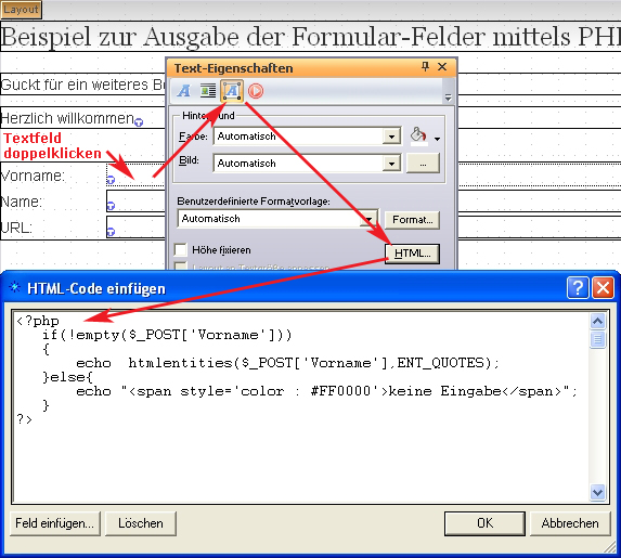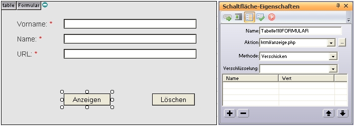 ... unten noch die Einstellungen der “Formular Schaltfläche” mit der Angabe zur Seite “anzeige.php” mit dem Skript.