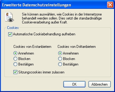 > Systemsteuerung > Netzwerk- und Internetverbindungen > Internetoptionen > Datenschutz > Erweitert > “Automatische Cookiebehandlung aufheben” anhaken