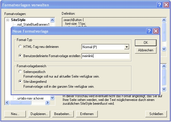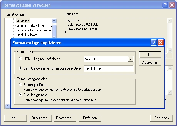 Als nächstes habe ich den Selektor “link” erstellt. Dazu habe ich meine CSS-Class .meinlink wieder markiert und dann im Fenster “Formatvorlagen verwalten” auf den Button “Duplizieren...” geklickt, dann wieder “Site-übergreifend” markiert und meine CSS-Class erneut eingetragen, jedoch diesmal noch den Selktor link hinzugefügt, der mit einem Doppelpunkt eingeleitet wird, also dann geschrieben: