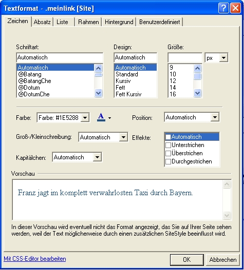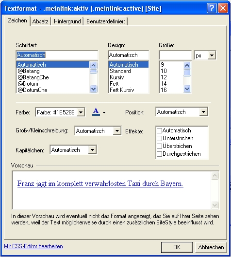 ... nachdem Ihr wieder auf den Button “OK” geklickt habt, öffnet sich wieder der Format-Editor. Hier habe ich nichts verändert und die vererbten Einstellungen meiner CSS-Class .meinlink so belassen.
