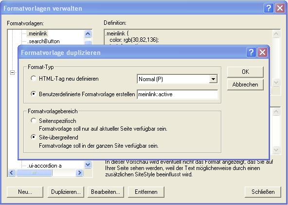 Als nächstes habe ich den Selektor “active” erstellt. Dazu habe ich meine CSS-Class .meinlink markiert und dann im Fenster “Formatvorlagen verwalten” auf den Button “Duplizieren...” geklickt, dann wieder “Site-übergreifend” markiert und meine CSS-Class erneut eingetragen, jedoch diesmal noch den Selktor active hinzugefügt, der mit einem Doppelpunkt eingeleitet wird, also dann geschrieben: