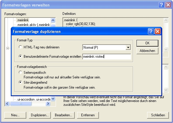 Als nächstes habe ich den Selektor “visited” erstellt. Dazu habe ich meine CSS-Class .meinlink wieder markiert und dann im Fenster “Formatvorlagen verwalten” auf den Button “Duplizieren...” geklickt, dann wieder “Site-übergreifend” markiert und meine CSS-Class erneut eingetragen, jedoch diesmal noch den Selktor visited hinzugefügt, der mit einem Doppelpunkt eingeleitet wird, also dann geschrieben: