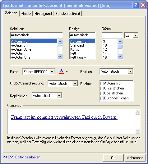... nachdem Ihr wieder auf den Button “OK” geklickt habt, öffnet sich wieder der Format-Editor. Hier habe ich lediglich eine andere Farbe gewählt und alles andere so gelassen. Es wird also alles, was ich in meiner CSS-Class .meinlink bereits eingetragen hatte, auch an die duplizierten Selektoren vererbt. Ich kann hier entscheiden, ob etwas anders dargestellt werden soll oder auch nicht. Hier nur die Farbe.