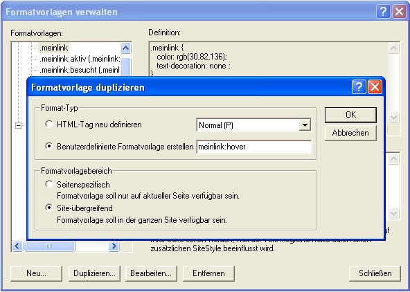 Als nächstes habe ich den Selektor “hover” erstellt. Dazu habe ich meine CSS-Class .meinlink wieder markiert und dann im Fenster “Formatvorlagen verwalten” auf den Button “Duplizieren...” geklickt, dann wieder “Site-übergreifend” markiert und meine CSS-Class erneut eingetragen, jedoch diesmal noch den Selktor hover hinzugefügt, der mit einem Doppelpunkt eingeleitet wird, also dann geschrieben: