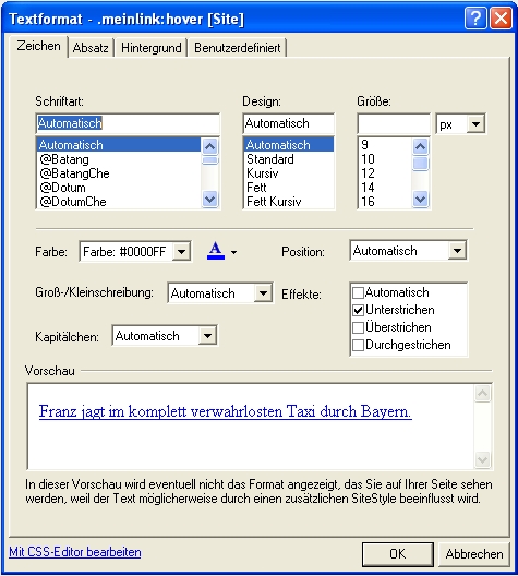 ... nachdem Ihr wieder auf den Button “OK” geklickt habt, öffnet sich wieder der Format-Editor. Hier habe ich lediglich eine andere Farbe gewählt sowie für hover (Mausüber) Unterstrichen gewählt und alles andere so gelassen.