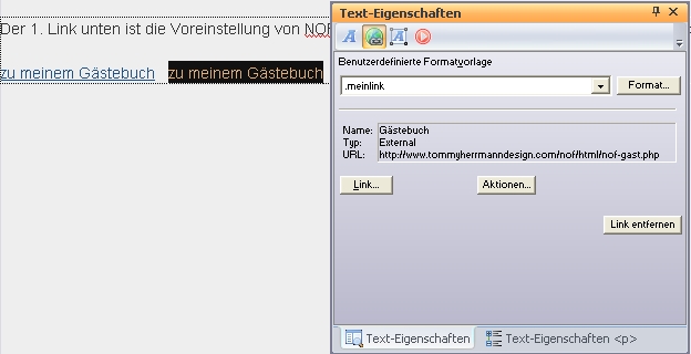 ... jetzt habt Ihr alle Sektoren für die CSS-Class (hier .meinlink) erstellt und müsst nun diese Klasse lediglich noch dem Link zuordnen. Ihr verlinkt also Euren Text zunächst ganz normal und klickt dann im Fenster “Text-Eigenschaften” oben auf den 2. Button “Link”. Dort sucht Ihr dann im Dropdown-Menü nach der gerade erstellten “Benutzerdefinierten Formatvorlage” (CSS-Class) .meinlink und fertig.