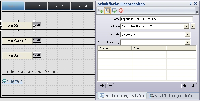 Ich habe mir hier für jeden Senden-Button einen eigenen Layout-Bereich aufgezogen, den ich mittels Häkchen als Formular deklariert habe. Dann habe ich den Senden-Button aufgezogen und im Fenster “Schaltfläche-Eigenschaften” unter Methode “Verschicken” gewählt und bei “Aktion” den anzusteuernden Layout-Bereich als internen Link eingetragen an den die Aktion geschickt werden soll - also hier: