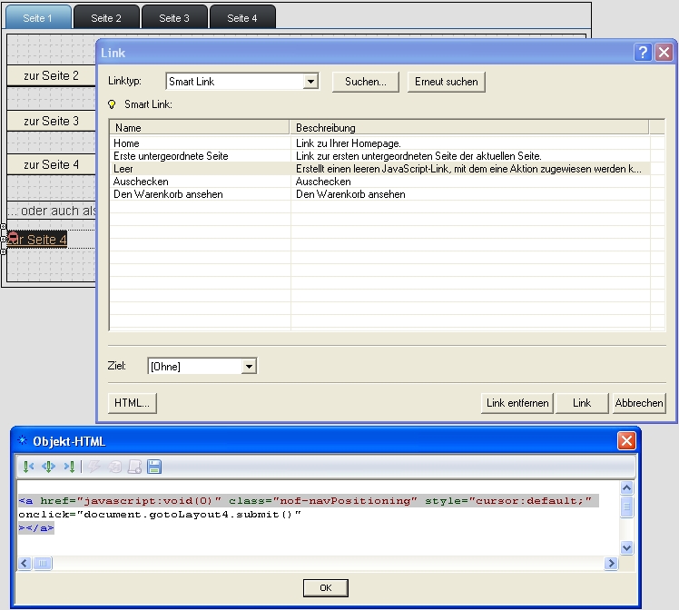 Nun markiert Ihr den für den Link zu verwendenden Text (hier “zur Seite 4”) und wählt im Link-Fenster als Typ “Smart Link” und dort dann “Leer” um eine Javascript-Anweisung eintragen zu können.