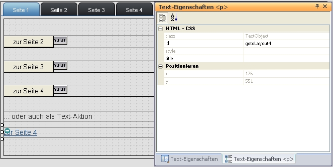 ... jetzt könnt Ihr im Fenster “Text-Eigenschaften” auch das <p> Tag bearbeiten und dort die ID eintragen. Ich habe diese ID hier “gotoLayout4” genannt.