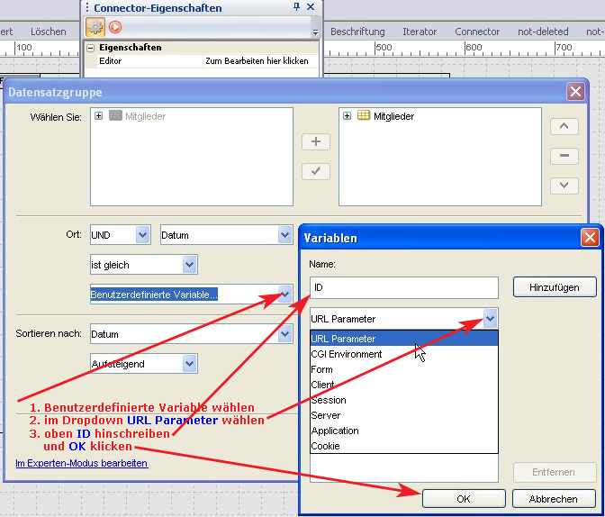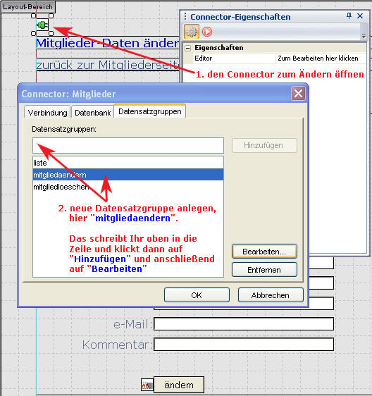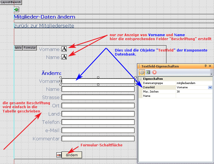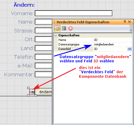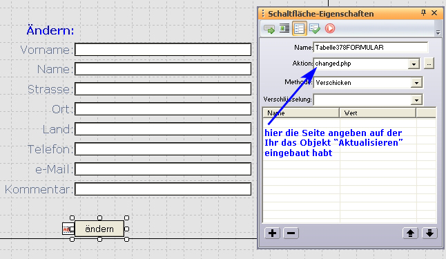 Da ich hier die ID der Person aus meiner Datenbank nicht zeigen und auch nicht bearbeiten will, habe ich hier ein “Verdecktes Feld” der Komponente Datenbank aufgezogen, mit den Eigenschaften der Datensatzgruppe und angegeben, dass auf das Feld “ID” geändert werden soll. Die ID, der Person, die hier geändert wird, wird also durch den “Sende-Button” an die Zielseite weitergegeben, auf der das Objekt “Aktualisieren” meine Datenbank entsprechend der (verdeckten) ID ändern wird.