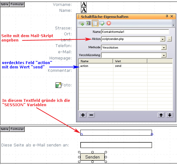 Als Methode “Verschicken” gewählt und noch ein verdecktes Feld “action” hinzugefügt mit dem Wert “send”, um im Mail-Skript zu prüfen, ob die Schaltfläche “Senden” überhaupt geklickt wurde.