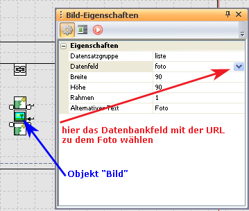 - Das Objekt "Bild" ist ein Datenausgabeobjekt, das verwendet wird, um auf Abfrageergebnissen beruhende Bild-Datenfelder anzuzeigen. Geben Sie alternativen Text ein und legen Sie die gewünschten Abmessungen für Rahmen, Höhe und Breite fest.