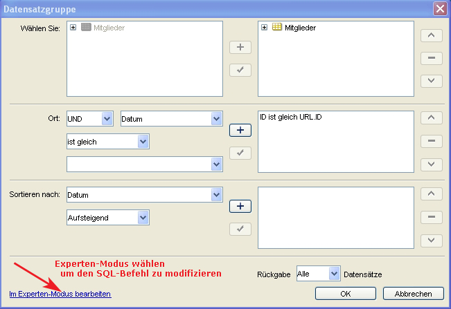 ... nun klickt Ihr unten im Fenster “Datensatzgruppe” auf “Im Experten-Modus bearbeiten”