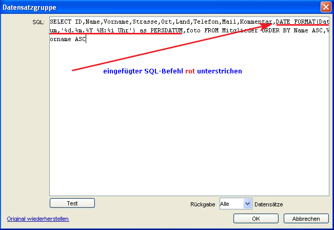 Wir ändern nun “händisch” an dieser Stelle den Code und ersetzen das Datenbank-Feld “Datum” mit einem neuen Feldnamen “PERSDATUM”, dem wir das zu verwendende Datums-Format angeben: