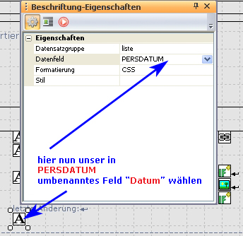 ... nun müssen wir bei dem neu aufgezogenen Objekt “Beschriftung” nur noch das von uns neu erstellte Datenfeld “PERSDATUM” wählen, sowie natürlich die dazugehörige Datensatzgruppe.