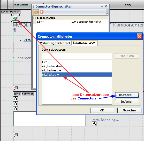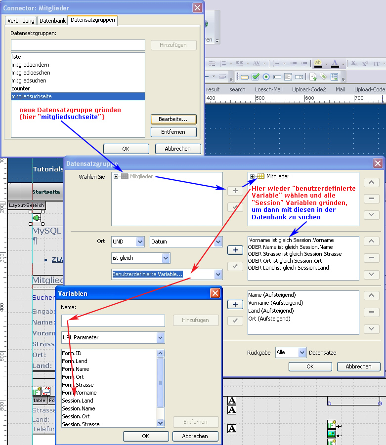 ... nun brauchen wir natürlich, um auf die neuen SESSION-Variablen zurückgreifen zu können, eine neue Datensatzgruppe (hier “mitgliedsuchseite”), in der wir zunächst sämtliche SESSION-Variablen gründen.