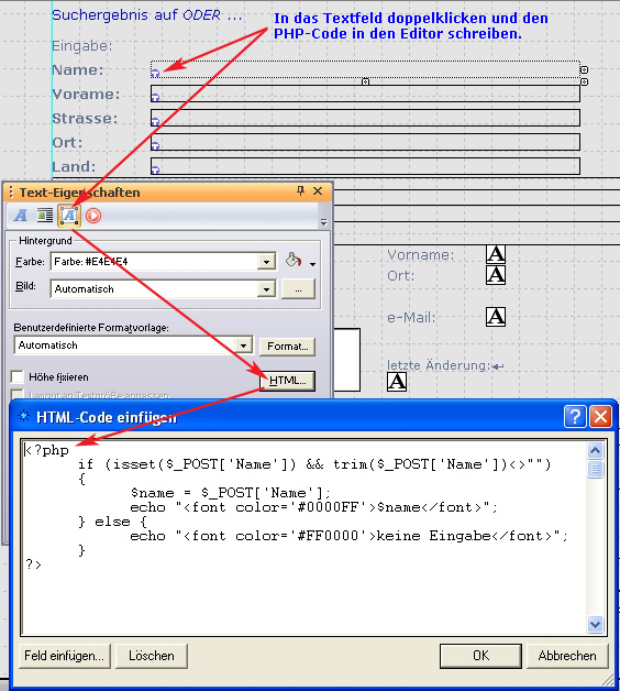 Ich habe ein Textfeld für jedes Eingabe-Feld aufgezogen und dort in den Code-Editor (siehe Bild unten) folgenden PHP-Code eingetragen, der mit einer IF-Bedingung überprüft, ob überhaupt eine Eingabe stattgefunden hatte.
