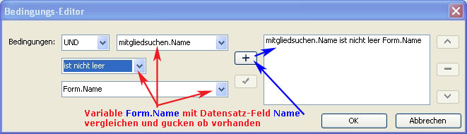 das bedeutet, dass die Varibale Name der Gruppe mitgliedsuchen nicht leer (also beschrieben ist) im gefundenen Datenbank Feld Name ist.