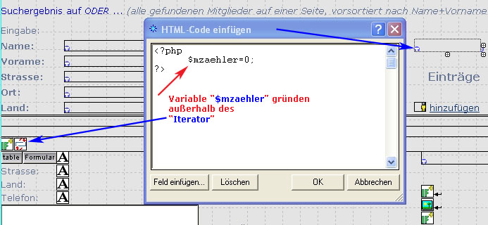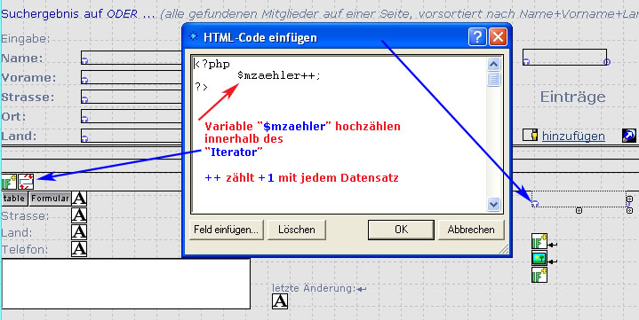 1.) eine Variable, die ich “$mzaehler” genannt habe, um sämtliche Datensätze zu zählen, die innerhalb des “Iterators” auf jeder Seite erscheinen (siehe die beiden folgenden Bilder unten).