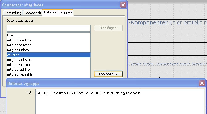 2.) Eine neue Datensatzgruppe “Counter” gegründet, der ich lediglich über den “Experten Modus” den unten stehenden “count” (zähl) Befehl gegeben habe, um alle Datensätze meiner gesamten Datenbank zu zählen. Hier auf das Datenfeld “ID” in eine Variable, die ich “ANZAHL” genannt habe.