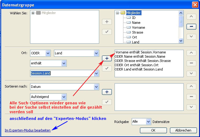 ... nachdem ich die Suchen-Optionen (wie oben im Bild) eingestellt habe, wechsele ich in den “Experten-Modus” um diese SQL-Befehle mit meinem “Count-Befehl” zu verbinden (siehe Bild unten).