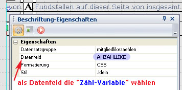 Nun muss ich nur noch ein “Beschriftungs-Objekt” an der Stelle einsetzen, wo die Zahl der gefundenen Datensätze erscheinen soll und dort als Datenfeld die Variable, auf die ich gezählt habe, auswählen.