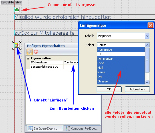 mit dem Objekt “Einfügen”. Wie schon am Anfang erwähnt, müssen alle Seiten, die auf die Datenbank zurückgreifen, das Objekt “Connector” tragen, diesen also erneut einfügen und Euren “Connector-Namen” (hier “Mitglieder”) wählen.