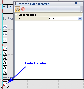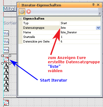 Fügt das Objekt “Iterator” oberhalb (Typ “Start” wählen) und unterhalb (Typ “Ende” wählen) der Anzeige Eurer Datensätze (Objekte “Beschriftung”) ein. Dieser grenzt jeden einzelnen Datensatz Eurer Datenbank ein. Gebt bei “Datensätze pro Seite” die Anzahl der Datensätze an, die auf einer Seite gleichzeitig angezeigt werden sollen. Zu den anderen Seiten gelangt man dann über den Navigator.