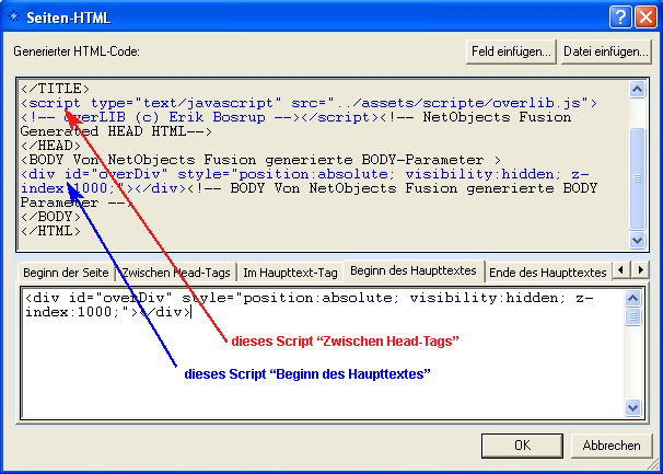 Auf das Layout klicken (oder Master-Rahmen) und im Fenster “Layout-Eigenschaften” (wie hier) oder “Master-Rahmen-Eigenschaften” auf den Button HTML klicken und die Overlib-Skripte unten einfügen: