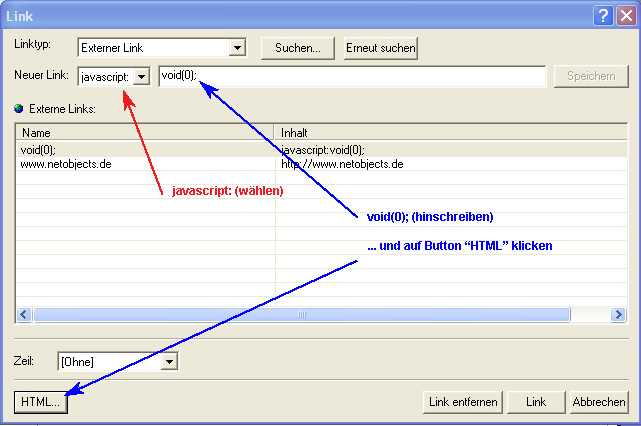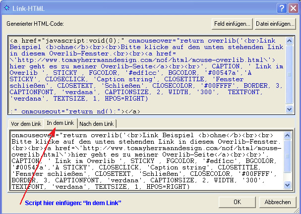 ... nach dem Klicken auf den Button “HTML” öffnet sich das Fenster “Link-HTML” (wie im Bild unten) Dort dann Deinen eigentlichen Code “In dem Link” einfügen und auf “OK” klicken..