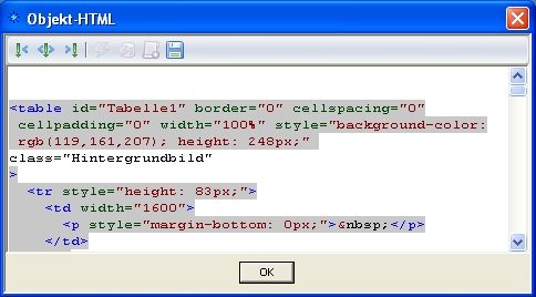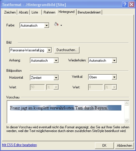 Solltet Ihr das Bild zentriert darstellen wollen (so wie ich es auf dieser Seite gemacht habe), dann müsst Ihr dafür eine neue Format-Vorlage (CSS-Class) gründen und das Bild dort, anstelle des Tabellen-Hintergrunds, angeben. Ihr könnte das Bild dann erst nach dem Publizieren sehen.