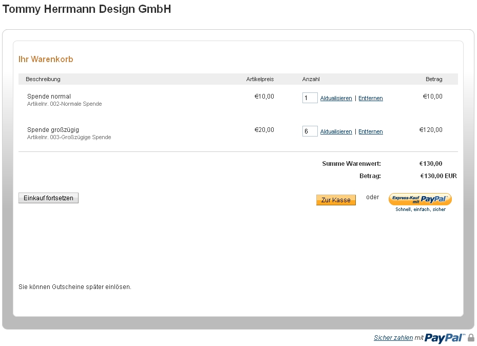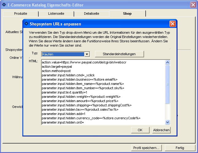So wie der Shop von NOF voreingestellt ist (URLs) müssen sämtliche Felder einen Eintrag erhalten - auch wenn dieser Wert 0.00 ist. Lasst also keine Felder, die einen numerischen Wert tragen, frei - sonst wird PayPal den Shop nicht anzeigen. Bei Umsatzsteuer wird nicht der Prozentsatz, sondern der Steuerbetrag eingetragen. Sollte sich der Prozentsatz ändern, müsst Ihr an dieser Stelle die neue Umsatzsteuer eintragen.