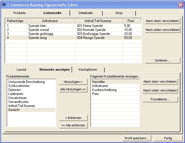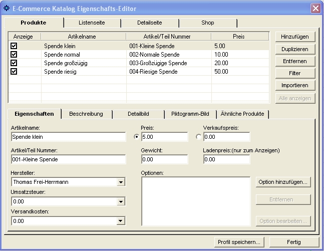 Die Einstellungen im Shop sind eigentlich selbsterklärend. Ihr fangt also beim Tab “Produkte” an und fügt beliebig viel Produkte hinzu. Die Reihenfolge könnt Ihr später auch ändern.