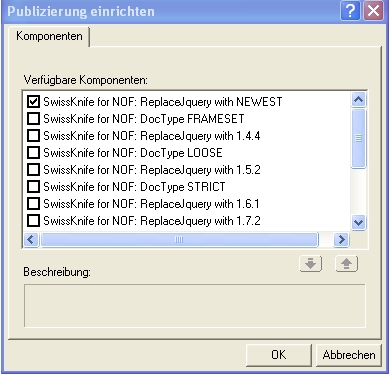 Nachdem Ihr diese Komponente installiert habt, könnt Ihr nun eine neuere jQuery Datei wählen. Bitte achtet darauf, dass damit das gesamte Projekt auf die neu gewählte jQuery Datei umgestellt wird. Wollt Ihr nur eine einzelne Seite mit dieser jQuery Datei publizieren, dann dürft Ihr auch nur diese eine Seite mit dieser Einstellung publizieren und zum Publizieren der anderen Seiten müsst Ihr den Haken wieder entfernen.