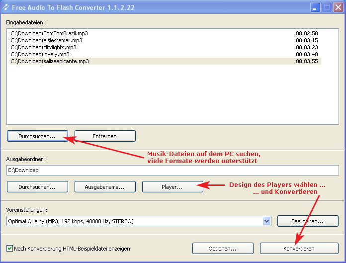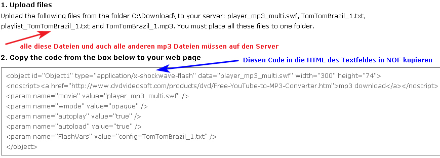 MP3 Dateien (alle meine MP3-Dateien, die das Programm generiert hat) player_mp3_multi.swf (eines von vielen Designs des Players, hier “Multi-Player”) playlist_TomTomBrazil_1.txt (die Liste aller MP3-Dateien die im Player stehen) TomTomBrazil_1.txt (die Konfigurations-Datei des Players)