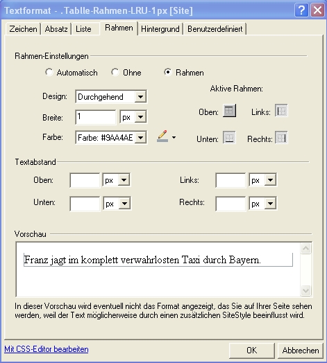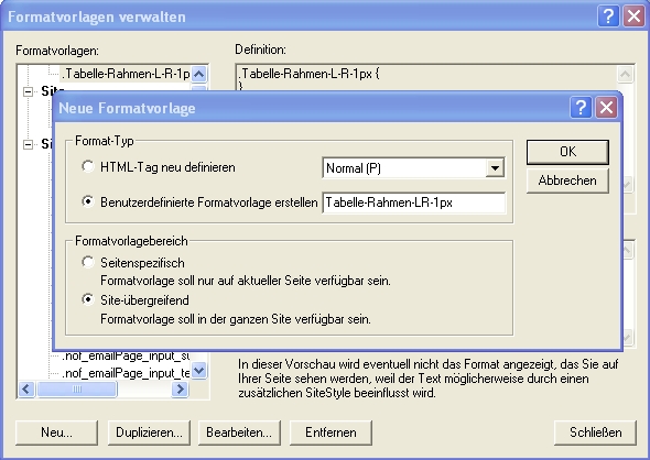 Hier könnt Ihr nun entscheiden, ob diese Vorlage “Seitenspezifisch” (eben nur auf der gerade bearbeiteten Seite) oder “Site-übergreifend” (also auf allen Seiten) Anwendung finden soll. Markiert “Benutzerdefinierte Formatvorlage erstellen” und gebt Eurer Vorlage einen Namen, bitte verwendet dabei keine Leerzeichen, keine Umlaute oder andere Sonderzeichen, keine Ziffern am Anfang und keine Doppelpunkte.