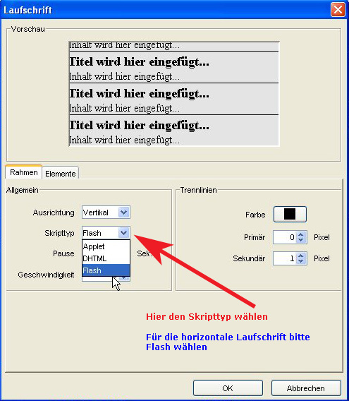 Unten ein Foto dieser Komponente. Bitte wählt bei Ausrichtung “Horizontal” den Skripttyp “Flash”, sonst bekommt Ihr einen horizontalen Scrollbalken auf Eurer Seite, der in der Geschwindigkeit der Laufschrift mitscrollt (Bug von NOF).