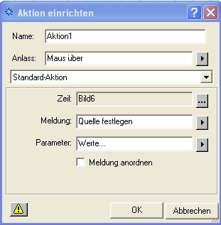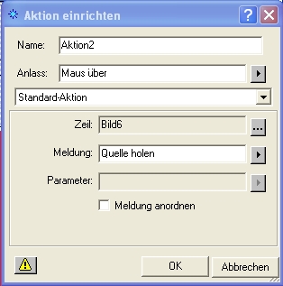 nun klickst Du erneut auf das “+” Zeichen um die 2. Aktion zu bestimmen und nimmst folgende Schritte vor:> Anlass = > Maus > Maus über wählen > Meldung = > Mermal holen > Quelle holen> OK bestätigen