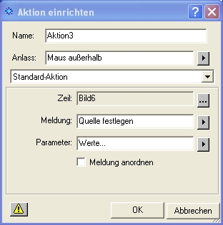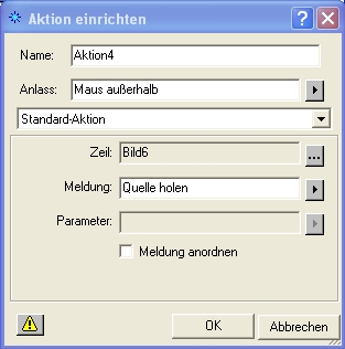 nun klickst Du erneut auf das “+” Zeichen um die 4. Aktion zu bestimmen und nimmst folgende Schritte vor:> Anlass = > Maus > Maus außerhalb wählen > Meldung = > Mermal holen > Quelle holen> OK bestätigen