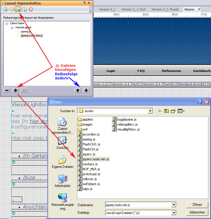 Dort kann man dann .js Dateien von seiner Festplatte mittels “+” Zeichen hinzufügen und mit den Pfeilen auch die Reihenfolge ändern. Mit dem “-” Zeichen kann man diese, so zugefügten Dateien auch wieder entfernen. Mit dem Doppelpfeil (in beide Richtungen) kann man vorhandene Skriptdateien austauschen.