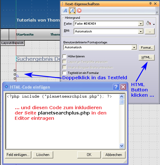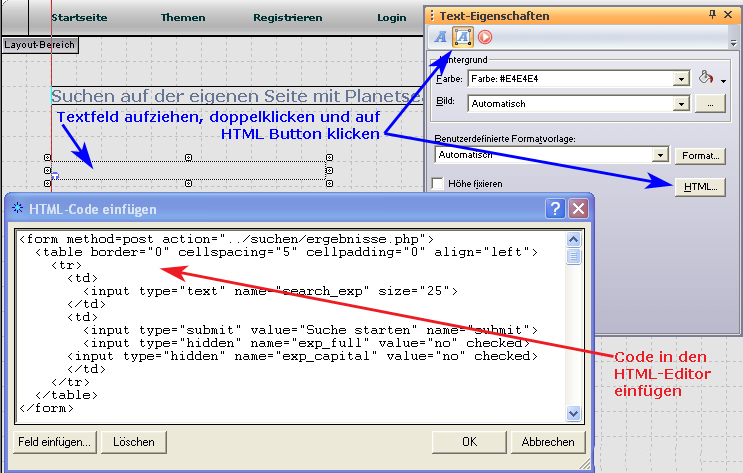 Dann inkludiert Ihr die Seite von “Planetsearch” in die HTML eines Textfeldes wie unten im Bild zu sehen mit folgendem Code: