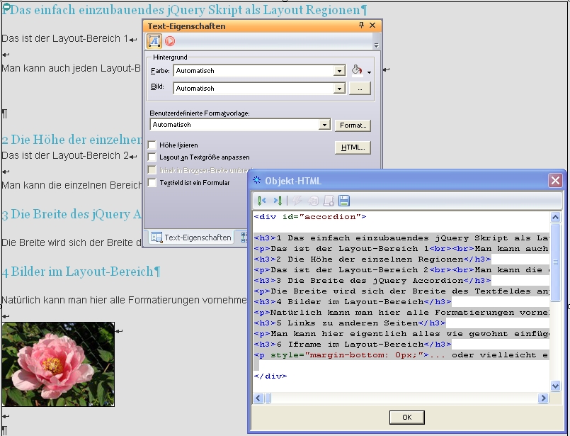 Das jQuery-Skript ist so geschrieben, dass es die Absatz-Formatierung “H3” erkennt und an dieser Stelle eine neue Layout-Region öffnet. Ihr macht also nach dem “H3” Tag, das Ihr im Fenster “Text-Eigenschaften” unter “Absatz” findet, einen “harten” Umbruch (Enter-Taste). Innerhalb einer Region dürft Ihr dann in NOF ausschließlich “weiche” Umbrüche setzen (Shift+Enter Taste), da sonst eine neue Layout-Region geöffnet wird. Nachdem Ihr Eure Eingabe für die 1. Layout-Region beendet habt, setzt Ihr dann also wieder einen “harten” Umbruch und dann die nächste Überschrift, die Ihr wieder als “H3” Tag formatiert.